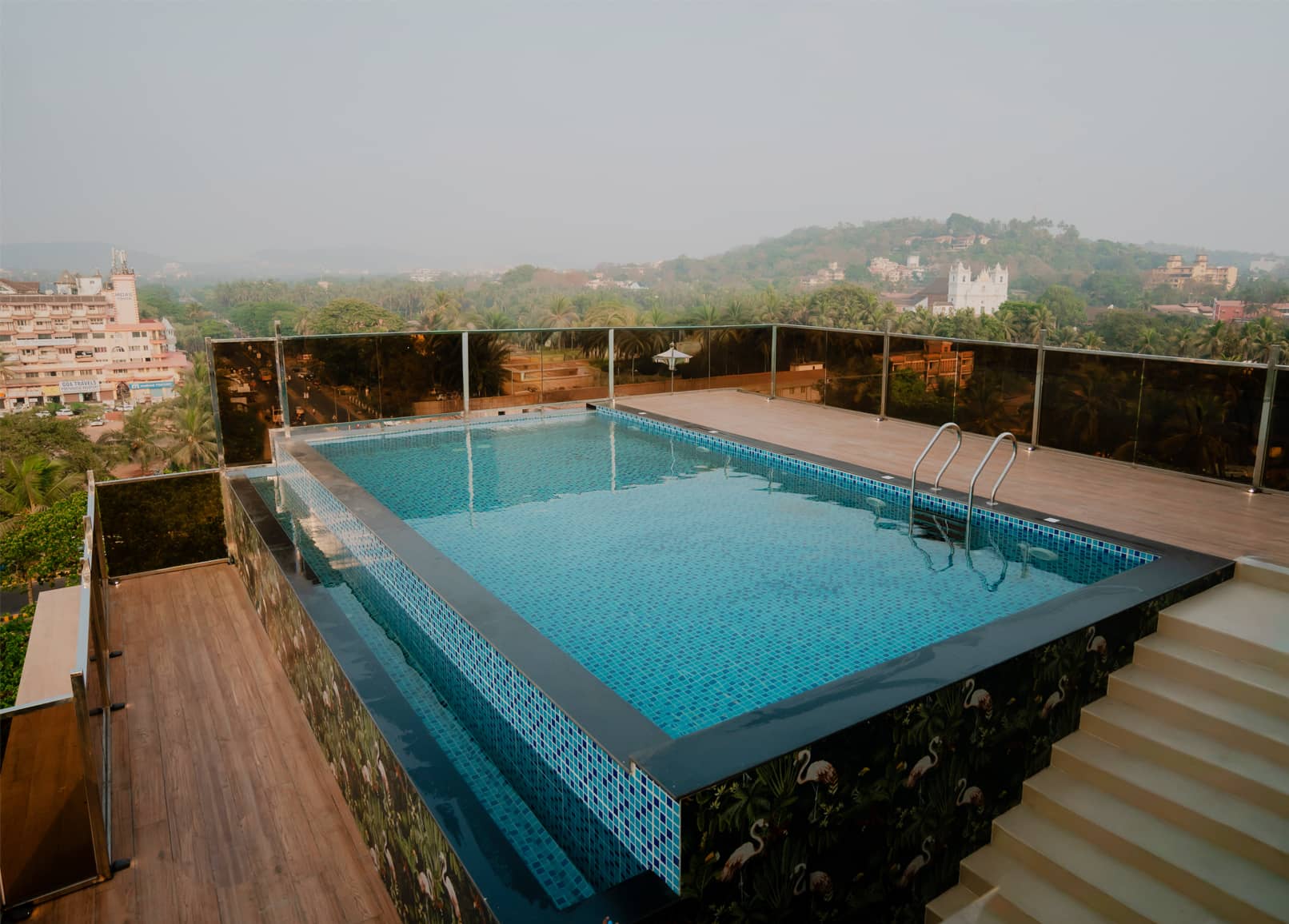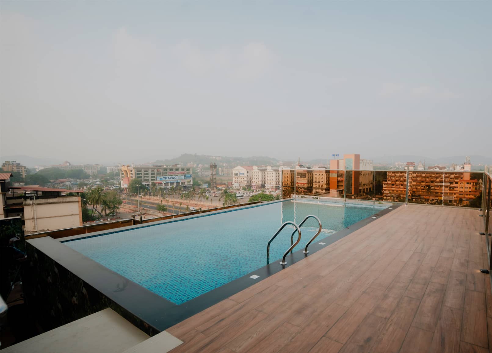 Experience relaxation at our rooftop infinity pool, offering breathtaking cityside views and a serene atmosphere above the vibrant streets of Margao. Designed for both leisure and tranquility, the pool provides the perfect space to unwind, take a refreshing swim, or simply enjoy the panoramic skyline. Whether it’s a calm morning dip or a peaceful evening by the water, the infinity pool creates a memorable and elevated stay experience.