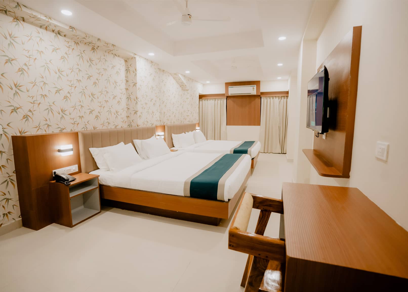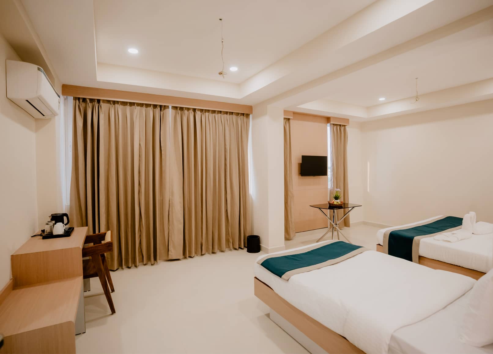 Spacious and versatile room with King size bed and flexible extra bedding options, designed for families and group travelers seeking comfort and convenience. The Executive Grand Room features modern interiors, comfortable bedding, work desk, wardrobe, attached bathroom with premium fittings, tea and coffee maker, LED TV and complimentary high-speed Wi-Fi and LAN connectivity, ensuring a comfortable and enjoyable stay for multiple guests.