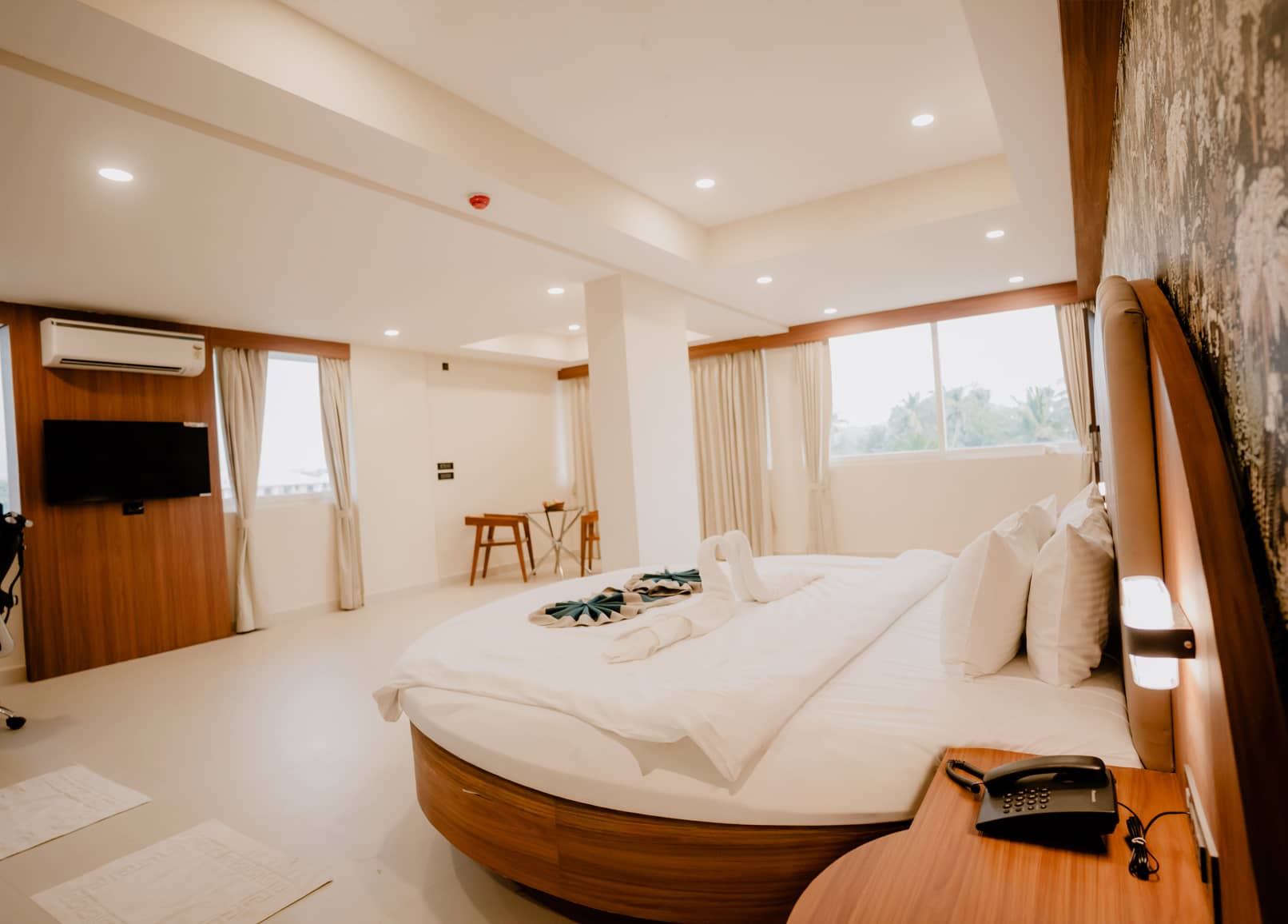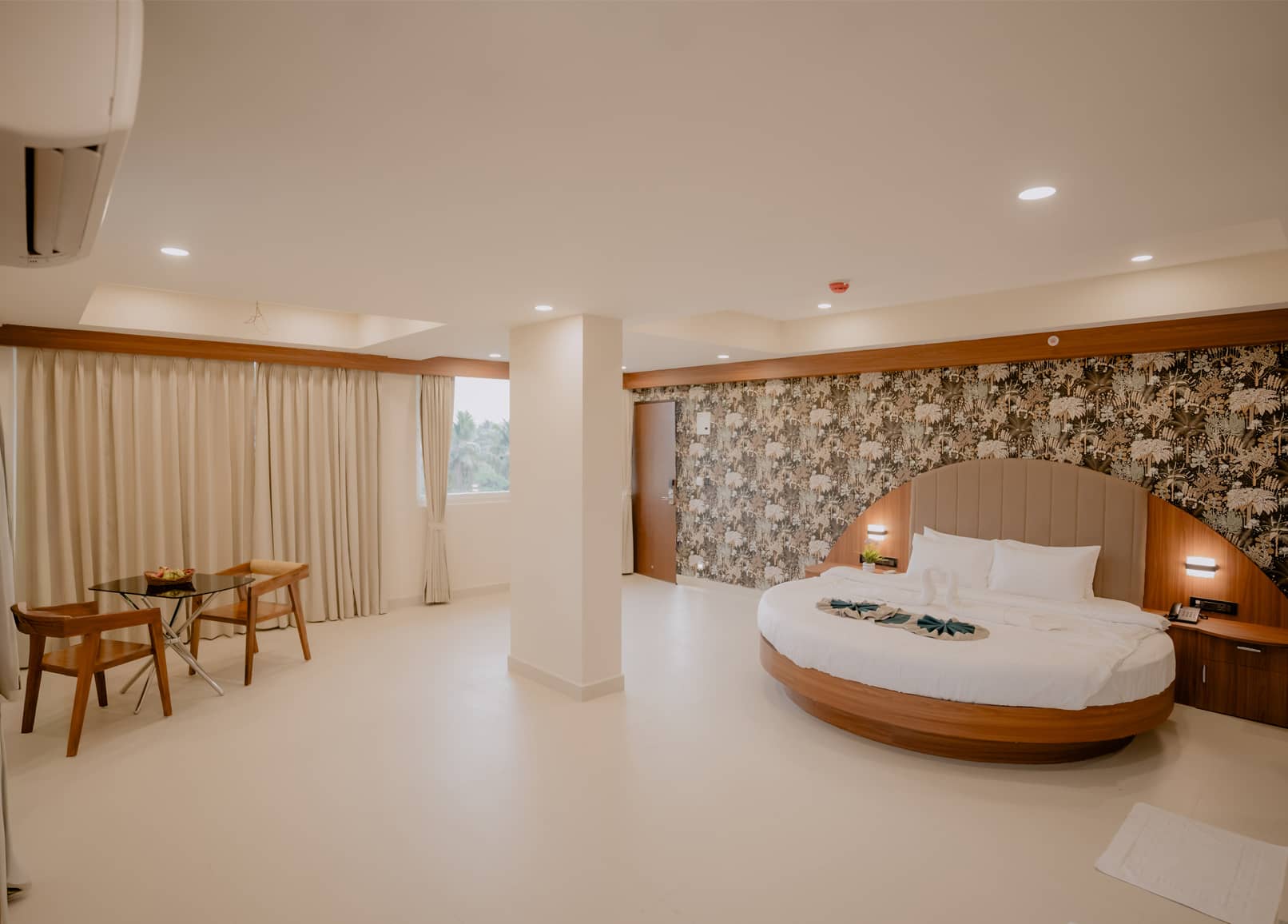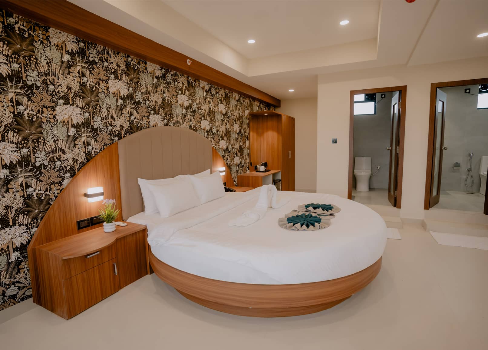 Spacious and elegantly designed suite with a King size bed and luxurious interiors, crafted for guests seeking comfort, privacy, and indulgence. The Royal Suite features a generous layout with premium furnishings, a relaxing bathtub, comfortable seating area, work desk, wardrobe, attached bathroom with luxury fittings, tea and coffee maker, LED TV, and complimentary high-speed Wi-Fi and LAN connectivity, ensuring a refined and memorable stay experience.