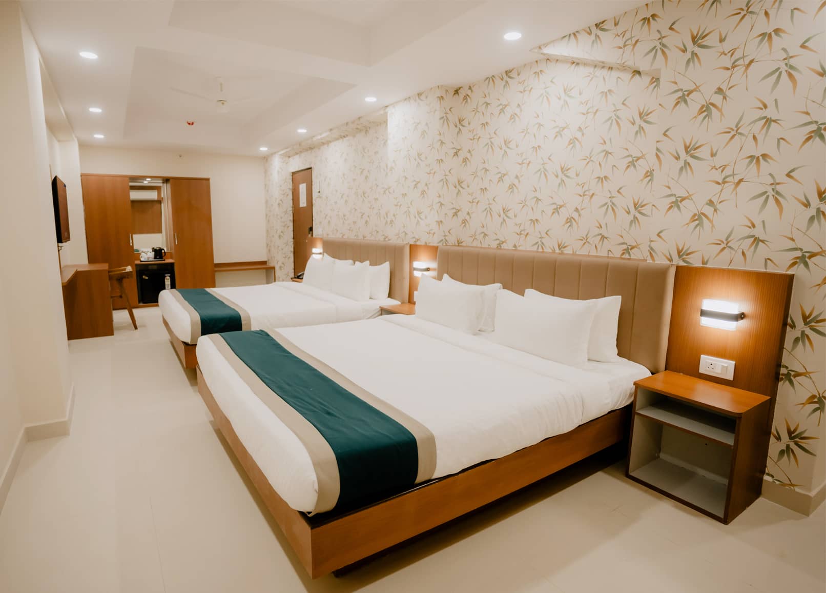 Spacious and versatile room with King size bed and flexible extra bedding options, designed for families and group travelers seeking comfort and convenience. The Executive Grand Room features modern interiors, comfortable bedding, work desk, wardrobe, attached bathroom with premium fittings, tea and coffee maker, LED TV and complimentary high-speed Wi-Fi and LAN connectivity, ensuring a comfortable and enjoyable stay for multiple guests.